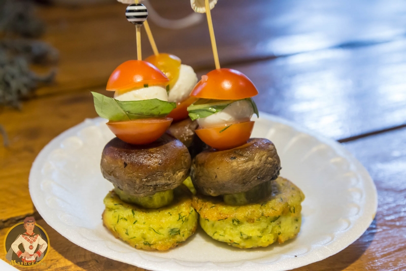 Студенты университета продовольствия вдохновились такой формой подачи блюда, как канапе и приготовили своё фирменное «Дранапе». На шпажке от команды «Удовольствие» вы найдёте, конечно же, драник, а также фаршированный луком шампиньон и сыр моцарелла в помидоре черри.