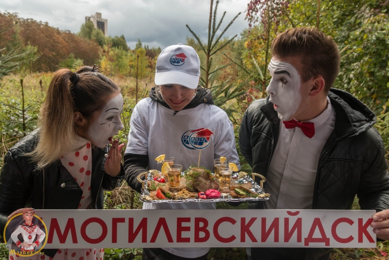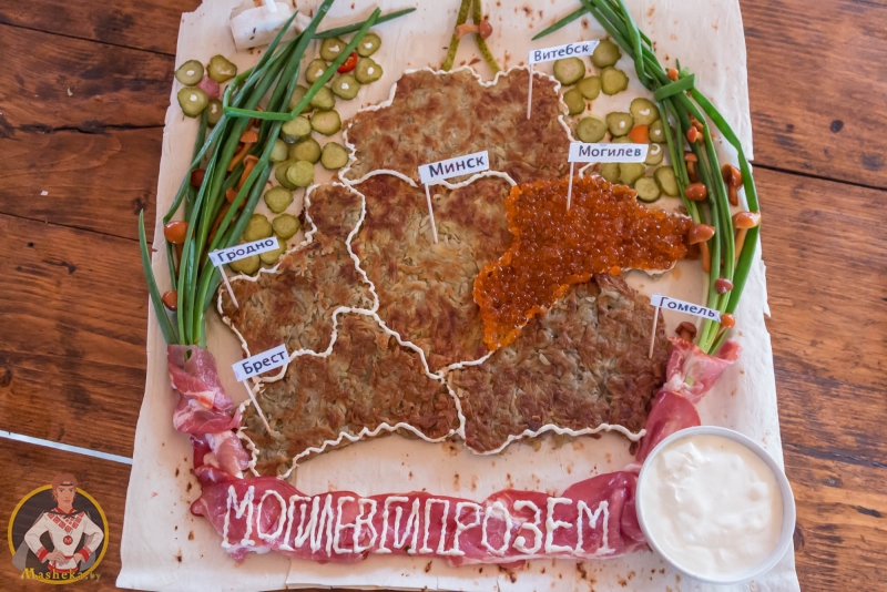 от команды «Могилёвгипрозем»Большой белорусский драник был приготовлен в форме карты Беларуси и герба самого предприятия. Среди всех областей была выделена Могилёвская, как непосредственное место деятельности организации. Драник, который соответствовал Могилёвской области, команда украсила красной икрой. Колосья на гербе заменили стрелы лука, а васильки - маринованные грибочки. Вместе с драниками подавался бекон.