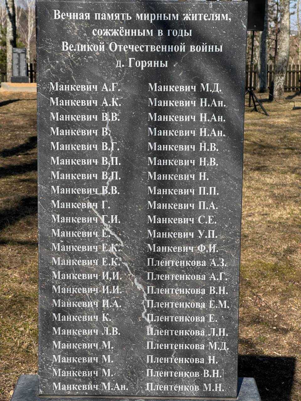 В деревне Горяны у памятника сожженным заживо мирным жителям собрались представители районной власти, депутатского корпуса, ветераны труда, представители трудовых коллективов, общественных организаций, политических партий, молодежь и местные жители.