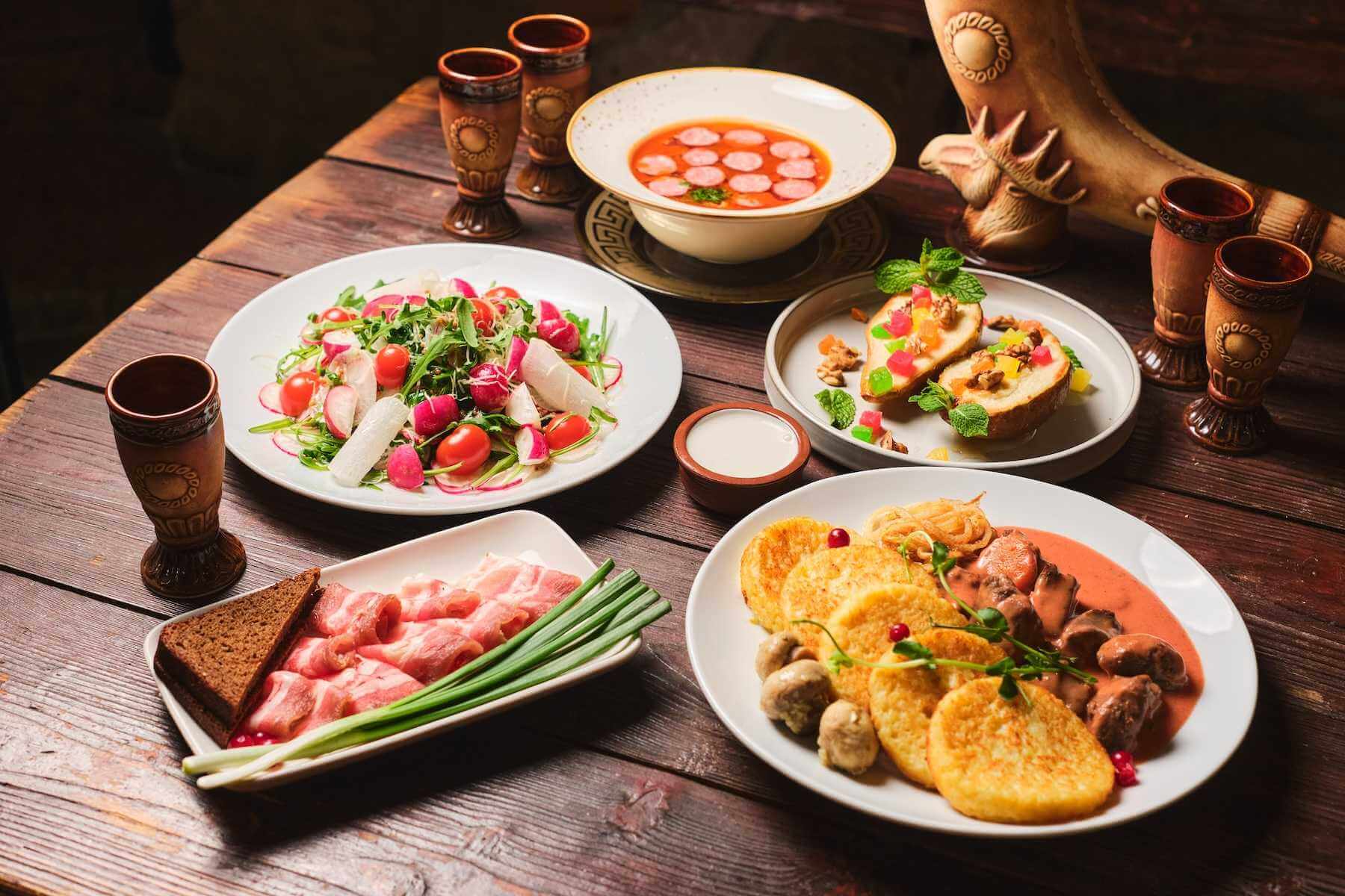 - «Наряд на обед» (фирменный шашлык из сочной свиной шеи, приготовленный на открытом огне. Дополняется ароматным чесночным картофелем, воздушным лавашом и освежающим кефирным соусом)