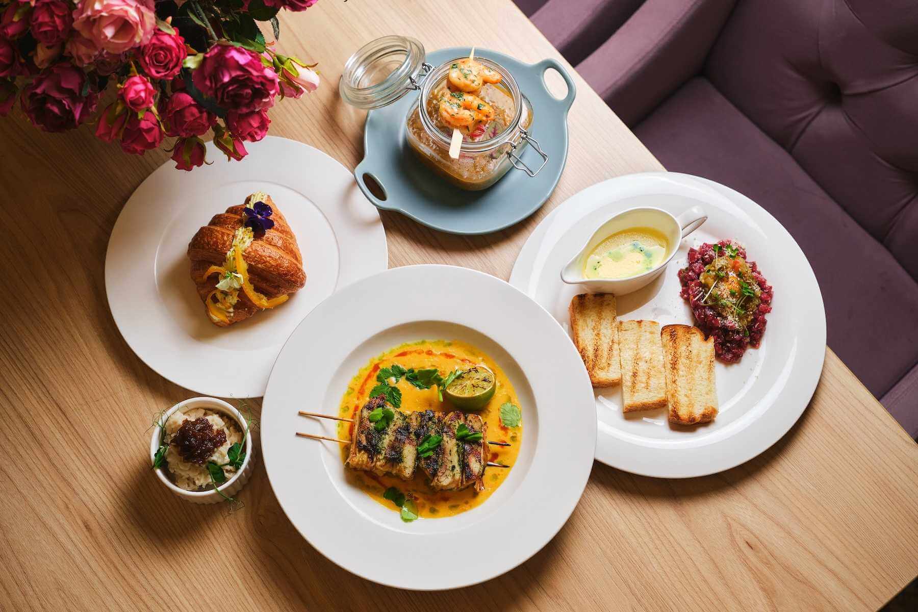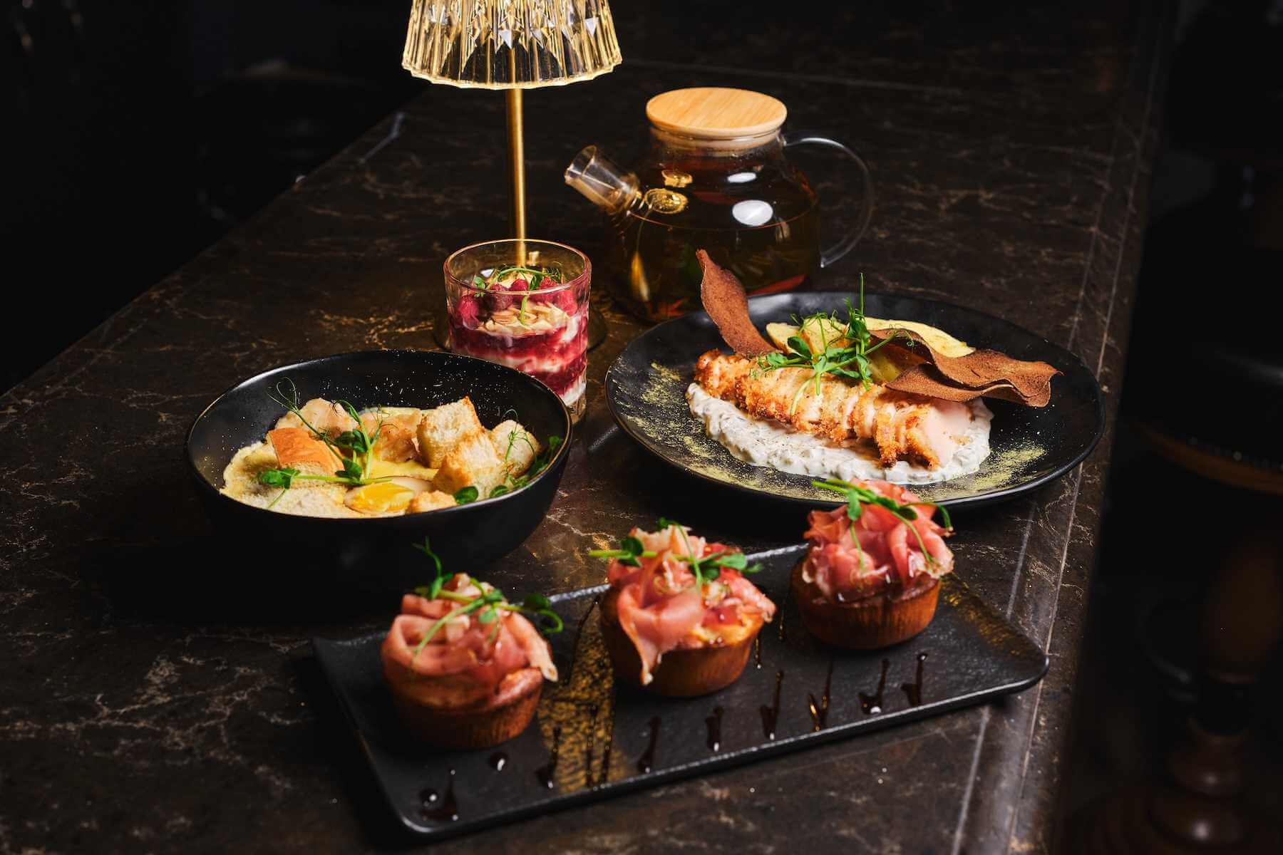 - Классический тартар из говядины с теплым соусом из сыров с бриошью и огуречным релишем