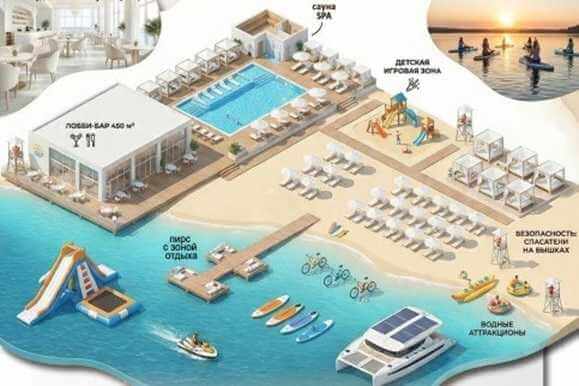 Как видно из описания и визуализации, планируют создание благоустроенной территории у воды. Центральную часть комплекса займет пространство для пляжного отдыха, которое может вместить до 450 человек и более. Также на берегу появится лобби-бар (450 квадратов), детская игровая зона, пирс, водные аттракционы и зона СПА с сауной и бассейнами на террасе.