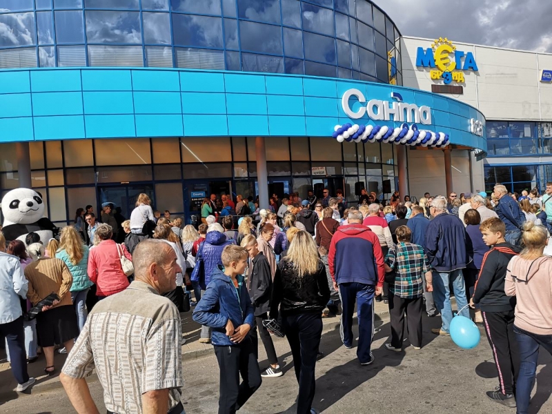 Большой магазин «Санта» заработал в Могилеве на улице Габровской, 32. Супермаркет отличают рыбный остров с голландским матиасом, гастро-зона с готовыми блюдами, пекарня и пиццерия. Открытие вызвало небывалый ажиотаж: у дверей собралось около 1000 человек, а за кассами их ожидало бесплатное мороженое.
