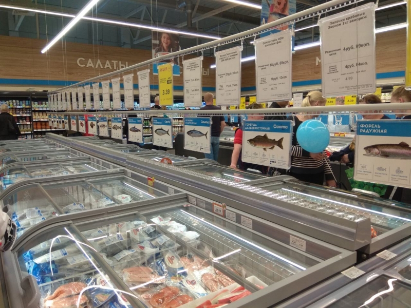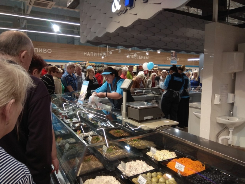 Площадь супермаркета – около 1000 «квадратов», а на полках представлено более 12 000 наименований товаров. Внутри можно найти все привычные отделы, но с расширенным выбором молочных продуктов, колбас и копченостей. Рядом собрано множество свежих овощей и фруктов, среди экзотики были замечены инжир и лайм. Покупатели охотно разбирали дыни за 99 копеек и арбузы меньше чем за полрубля.