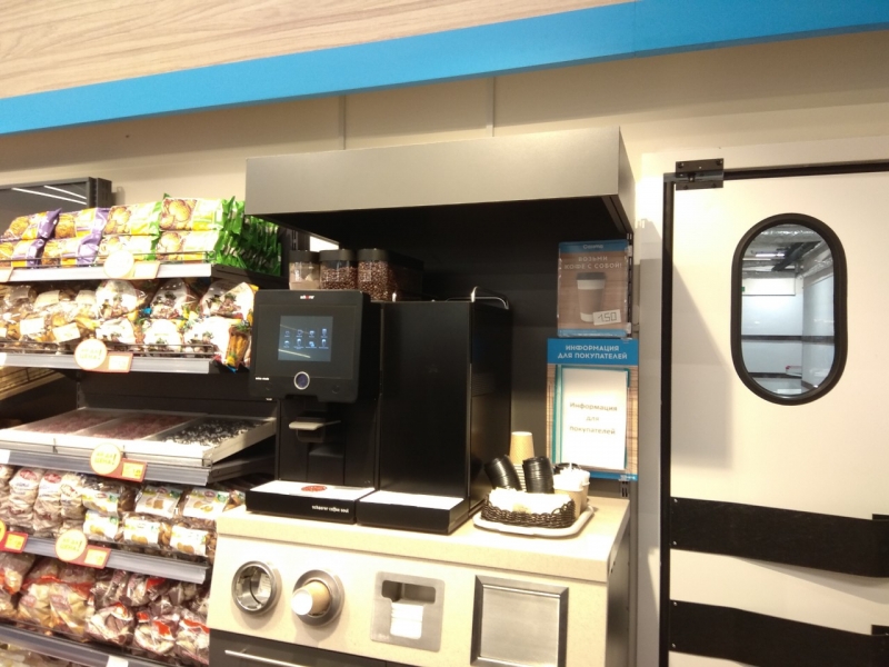 Покупателей обслуживают восемь касс. Работает магазин с 8 до 23 часов.