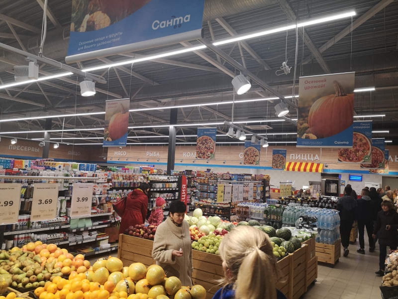В магазине собрано около 12 000 наименований товаров. В частности, в мясном отделе представлен богатый выбор колбас и копченостей. Много здесь и молочных продуктов, в том числе новинок «Савушкин продукт». Внимание покупателей привлекают свежие фрукты и овощи. Наибольшим спросом пользовались белорусские яблоки и груши.