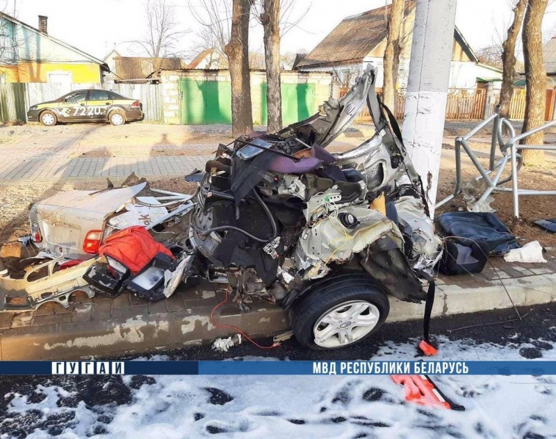 По предварительной информации, сегодня около 2 часов ночи в Могилеве на ул. Первомайской автомобиль Mercedes совершил наезд на металлическое ограждение и световую опору. От удара машину разорвало на две части, а находившихся в ней мужчину и женщину выбросило из салона.