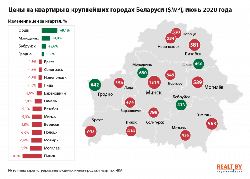 Бобруйск, напротив, был одним из 4 городов страны, где цены на квартиры за квартал выросли. Средняя цена квадратного метра в городе на конец квартала составила 433 $ (+3%).