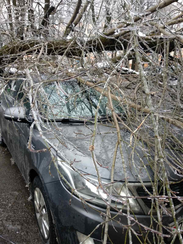 Мне ветка сделала на машине вмятину на крыше. Позвонила сразу в ГАИ, они в свою очередь перенаправили мое сообщение местному участковому. Через минут 30 он приехал, сделал фото, я написала заявление и подписала протокол, как все произошло.