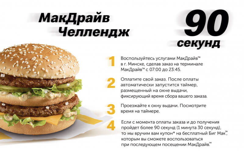 Отличным вариантом для всех, кто предпочитает забрать свой заказ самостоятельно, будет посещение МакДрайва. Для того, чтобы продемонстрировать, что мы всегда в тонусе и уверены в высокой скорости обслуживания, мы запустили акцию МакДрайв Челлендж.