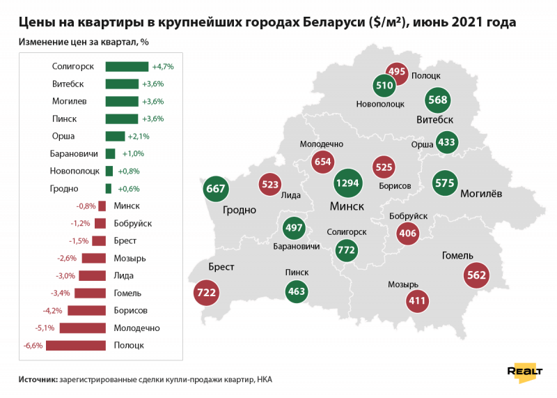 За квартиры в Могилеве в июне платили в среднем 575 $/м2, что на 4% больше, чем кварталом ранее. В Бобруйске, напротив, за последние три месяца квартиры стали дешевле на 1% - квадратный метр продавали в среднем за 406 $.