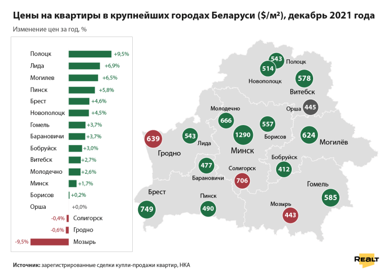 Как сообщает Realt, за квадратный метр квартир в Могилеве в декабре 2021 года платили в среднем 624 $, что сразу на 7% выше, чем в аналогичный период предыдущего года. В Бобруйске за год квартиры тоже подорожали, но менее существенно — на 3% (до 412 $/м2).