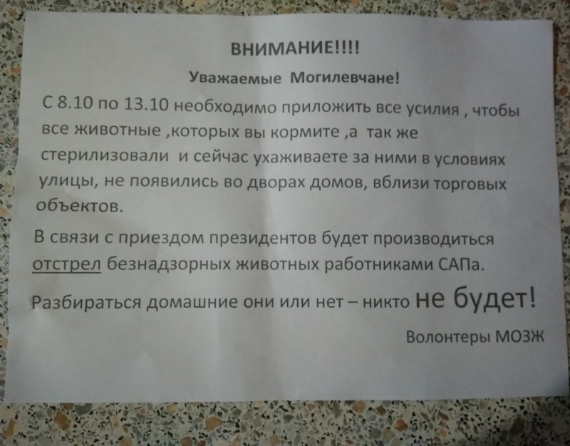 10 октября в Могилеве появились сообщения о том, что из-за приезда президентов Беларуси и России Александр Лукашенко и Владимира Путина на Форум регионов в городе «будет вестись отстрел бездомных животных» работниками спецавтопредприятия.