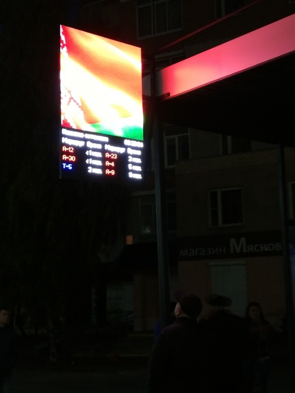 Пост с комментарием: "на остановке Мира, новое табло, показывает время -погоду и через сколько будет автобус на остановке )"от подписчика: Елизавета Кравцова