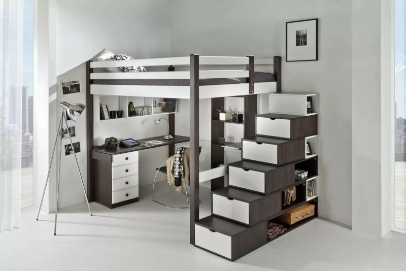 Задача организации эргономичного пространства в помещении с ограниченной площадью легко решается покупкой кровати-чердака (иногда ее еще называют лофт-кровать). Это все та же знакомая нам двухэтажная конструкция, но с некоторыми изменениями. Спальное место здесь одно. Находится оно на верхнем ярусе, словно на чердаке. Нижнее пространство занимает игровая или рабочая зона, шкаф, комод или диван.Для малышей 3-5 лет оптимальным вариантом станет кровать-чердак с высокими нижними ящиками. Дополнительная физнагрузка — это и весело, и полезно для развития. Но каждому возрасту свои вершины: лесенка в идеале должно состоять из 3-4 ступенек. В целях обеспечения безопасности спальное место на втором ярусе оснащается бортиками.